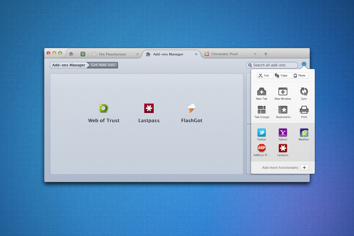 Természetesen manuálisan is testre szabható lesz, ha a dinamikus megoldás nem válna be valakinek. Egy új add-on eszköztár is bekerül. Az új felületet jopbb ha megszokjuk, ugyanis már biztos, hogy a Firefox 9 és a következő verziók (10, 11, 12) mind így fognak kinézni.