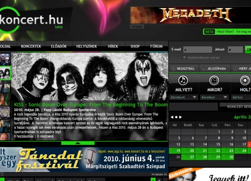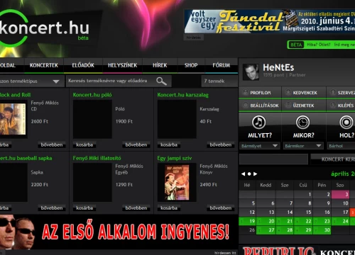 Az ország elsőszámú koncertmagazinja, amely a legnagyobb jegyértékesítő rendszerek adatbázisából szedi naponta az adatokat, így a szerkesztőknek az áttöltött eseményeket már csak szép olvasók számára is informatív formába kell hozniuk. A design tekintetében mindenképp egyedülálló portálról beszélhetünk, hiszen a sötétszürke és az élénkzöld meglehetősen jó párosításban kontrasztosan mégis szemet kímélően adja vissza az olvasó számára a tartalmat. A koncert.hu oldalon mindenki feltöltheti előadóit, koncertjeit, helyszíneit vagy akár a webshopban értékesíthet is. Az oldalhoz tartóznak jegyvásárló modulok is, amelyeken át az Interticket vagy akár a TicketExpressz hálózatóban is vásárolgathatunk az oldal elhagyása nélkül. A felhasználók az oldalon bejelölhetik kedvenceiket, értesítéseket kaphatnak az újdonságokról, üzenetet küldhetnek egymásnak vagy akár elkészíthetik saját profiljukat is. A rendszer számos helyen tartalmaz AJAX-os megoldásokat is de természetesen az alapja egy PHP motor.Megrendelő:Koncert.hu Kft.Üzembe helyezve:2010/04