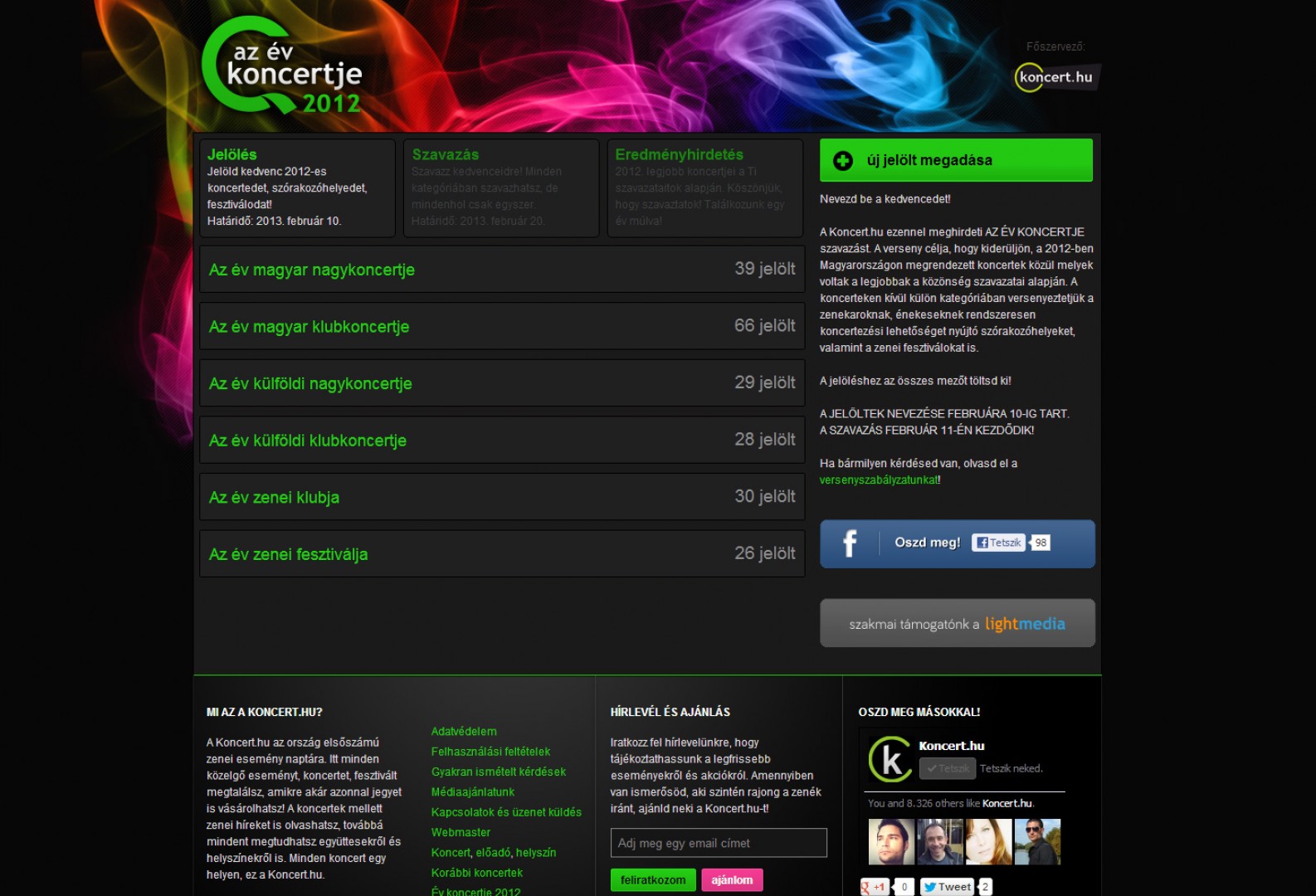 Az Év Koncertje Szavazás webes felületén keresztül lehetőség nyílik előre meghatározott kategóriákba eseményeket, előadókat és helyszíneket nevezni. A szavazás három körből áll első körben bárki jelölheti kedvencét, a második körben bárki szavazhat kategóriánként egy jelöltre a harmadik eredményhirdetés körben a rendszer összesíti a szavazatokat és megjelöli a nyerteseket. A koncert.hu adatbázisára épült webalapú szavazó rendszer számos további funkciót is tartalmaz. Többek között lehetőség nyílik a szavazatok megosztására illetve minden jelölő és voksoló az éppen aktuálisan induló körökről e-mailben kap tájékoztatást.Megrendelő:Koncert.huÜzembe helyezve:2013/02